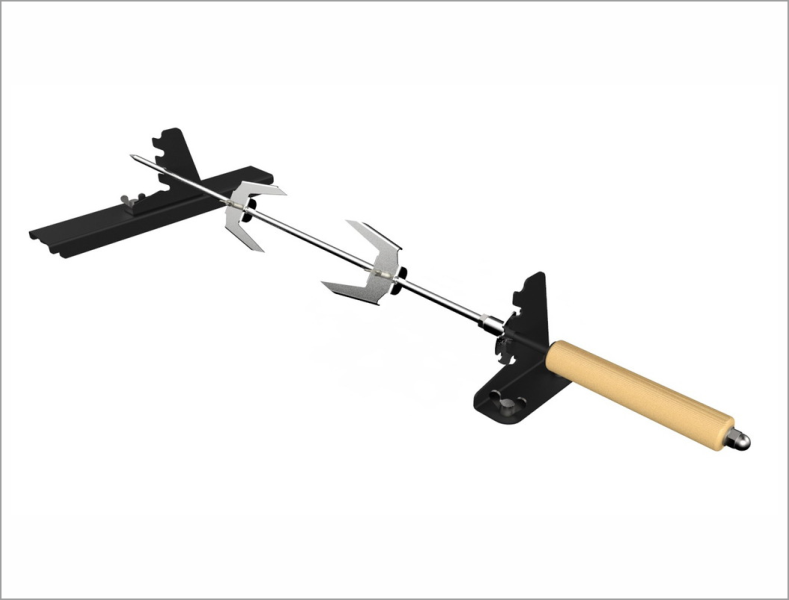 Комплект состоит из вертела и двух опор, одна из которых устанавливается на любую из боковых стенок мангала, а другая на стенки мангала в пазы для шампуров.