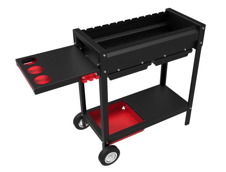 При перемещении мангал наклоняется, и предметы (кастрюли, пакеты, банки), находящиеся на полках, могут упасть. Поэтому для защиты от опрокидывания нижняя полка выполнена с корзиной, а боковая полка выполнена с ложементами для баночек и бутылок.